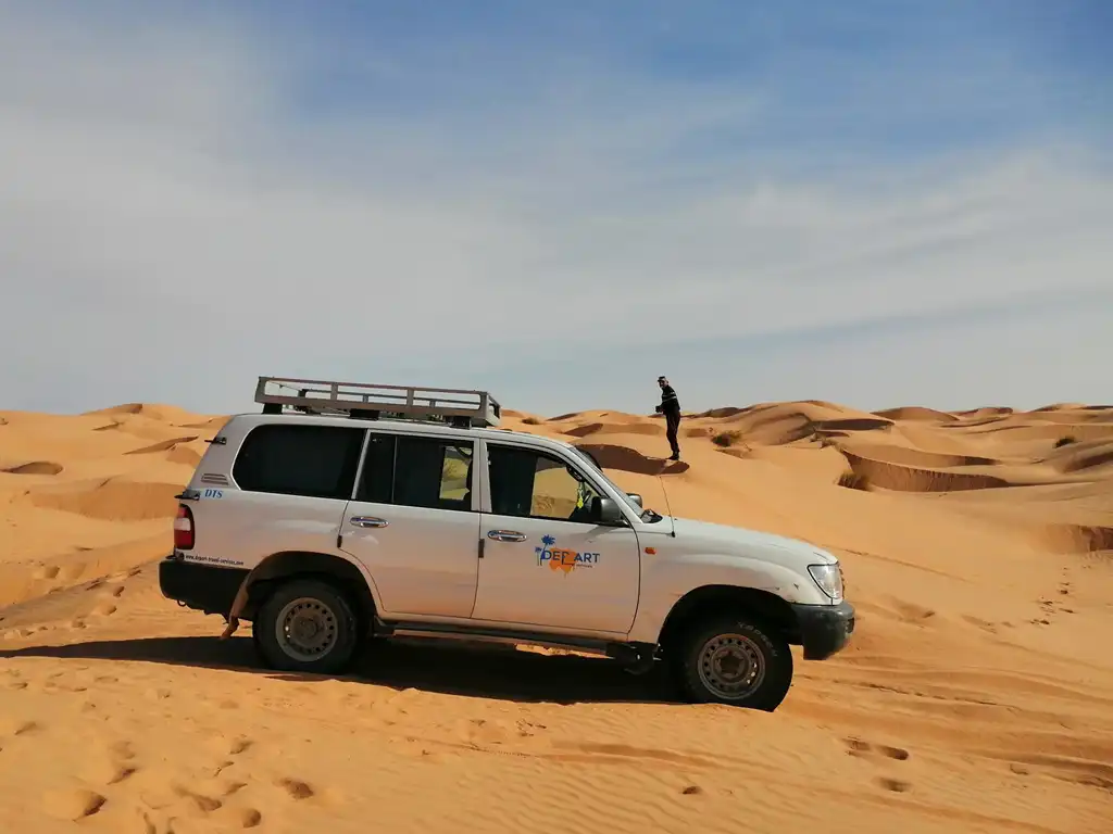 L’excursion se termine par la visite du site désertique d’ONG Jmal, connu pour ses dunes dorées et ses décors de films internationaux. Des pauses sont prévues pour les photos, la découverte libre et la détente, afin de profiter pleinement de chaque site. Cette excursion est adaptée aux couples, familles et petits groupes, avec un maximum de 7 participants, garantissant une expérience conviviale et personnalisée.